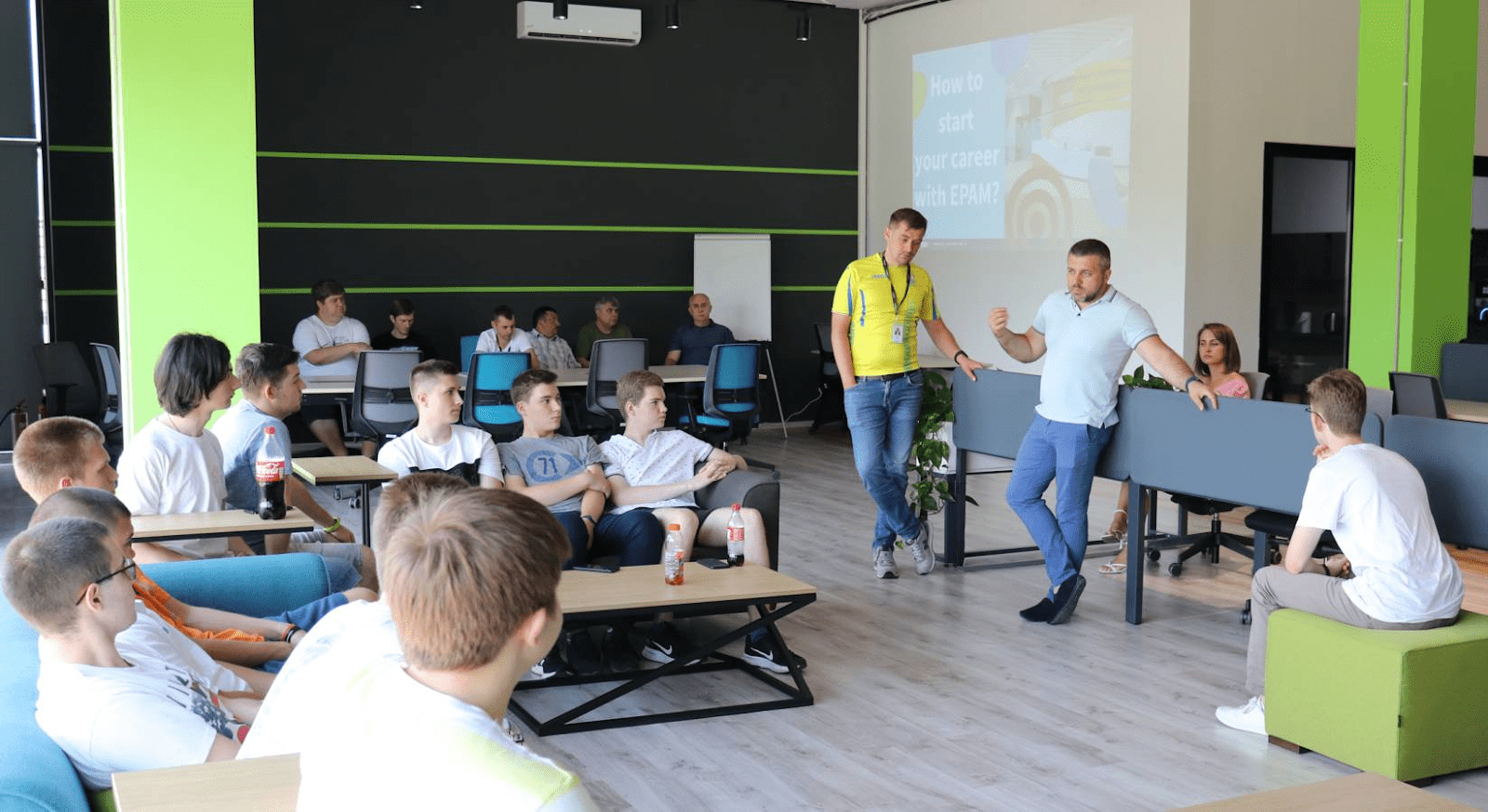 Компанія інвестує в навчання спеціалістів. Компанія розвиває програми для учнів 10-11 класів. Так школярі можуть більше дізнатися про можливі напрямки роботи в IT та зрозуміти, що більше їх цікавить. Крім цього, окремо функціонують програми для людей, які через війну втратили роботу і хочуть спробувати свої сили в IT. Ці програми доступні по всій Україні без прив’язки до місця розташування. Компанія, як вже можна було зрозуміти вище, більше орієнтується на закордон, а саме на США та країни Європи. Тому визначальним чинником для кандидатів є не лише логічні тести та знання коду, а й рівень англійської мови. 95% тих, хто успішно пройшов навчання, отримують роботу в EPAM на посаді молодшого інженера.